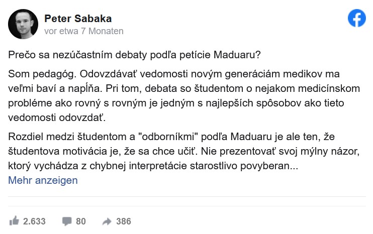 Ktorý z týchto expertov sa diskusie zúčastní, nie je známe, no už teraz vieme, že Peter Sabaka to nebude. Informoval o tom na svojom Facebooku. „Som učiteľ. Odovzdávať vedomosti novým generáciám medikov ma veľmi baví a napĺňa. Pri tom, debata so študentom o nejakom medicínskom probléme ako rovný s rovným je jedným s najlepších spôsobov ako tieto vedomosti odovzdať,“ píše v príspevku.